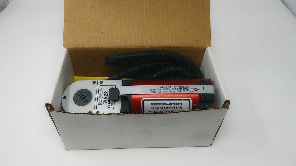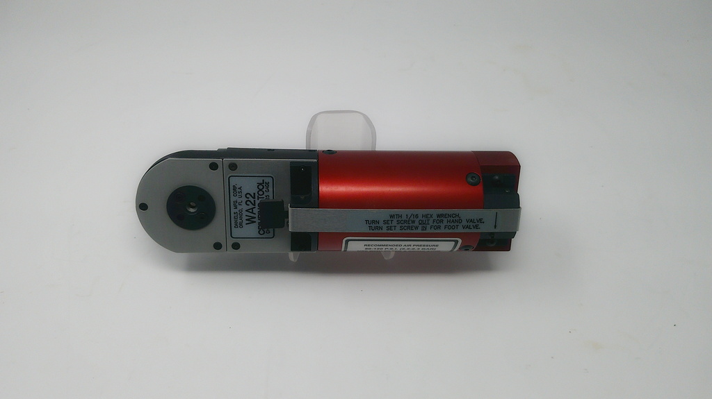8-Step Adjustable Pneumatic Crimp Tool equivalent to the M22520/2-01. This 8-step pneumatic crimp tool is a cycle controlled, precision crimp tool capable of crimping wire barrel sizes 20 to 28. This tool meets all the performance requirements of M22520/2-01. Air pressure of 80 P.S.I minimum is required to operate the crimping Tool. The recommended operating range is 80-120 P.S.I. An air regulator, filter and lubricator should be used for the long life and proper operation of the tool. The tool is portable but can be used bench mounted or suspended. This is a FULL CYCLE TOOL; once the cycle has been started the trigger will not release until the cycle is completed.